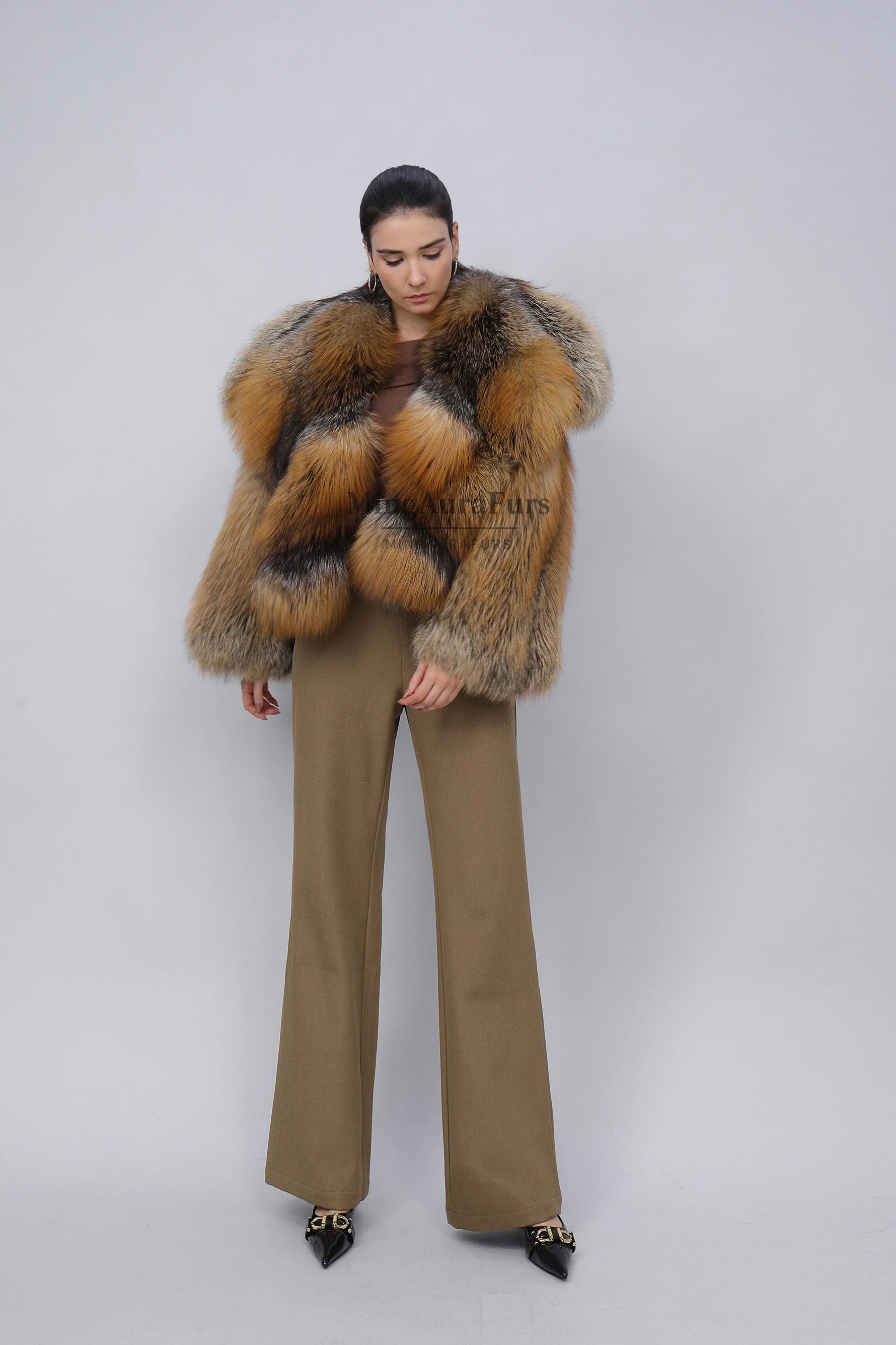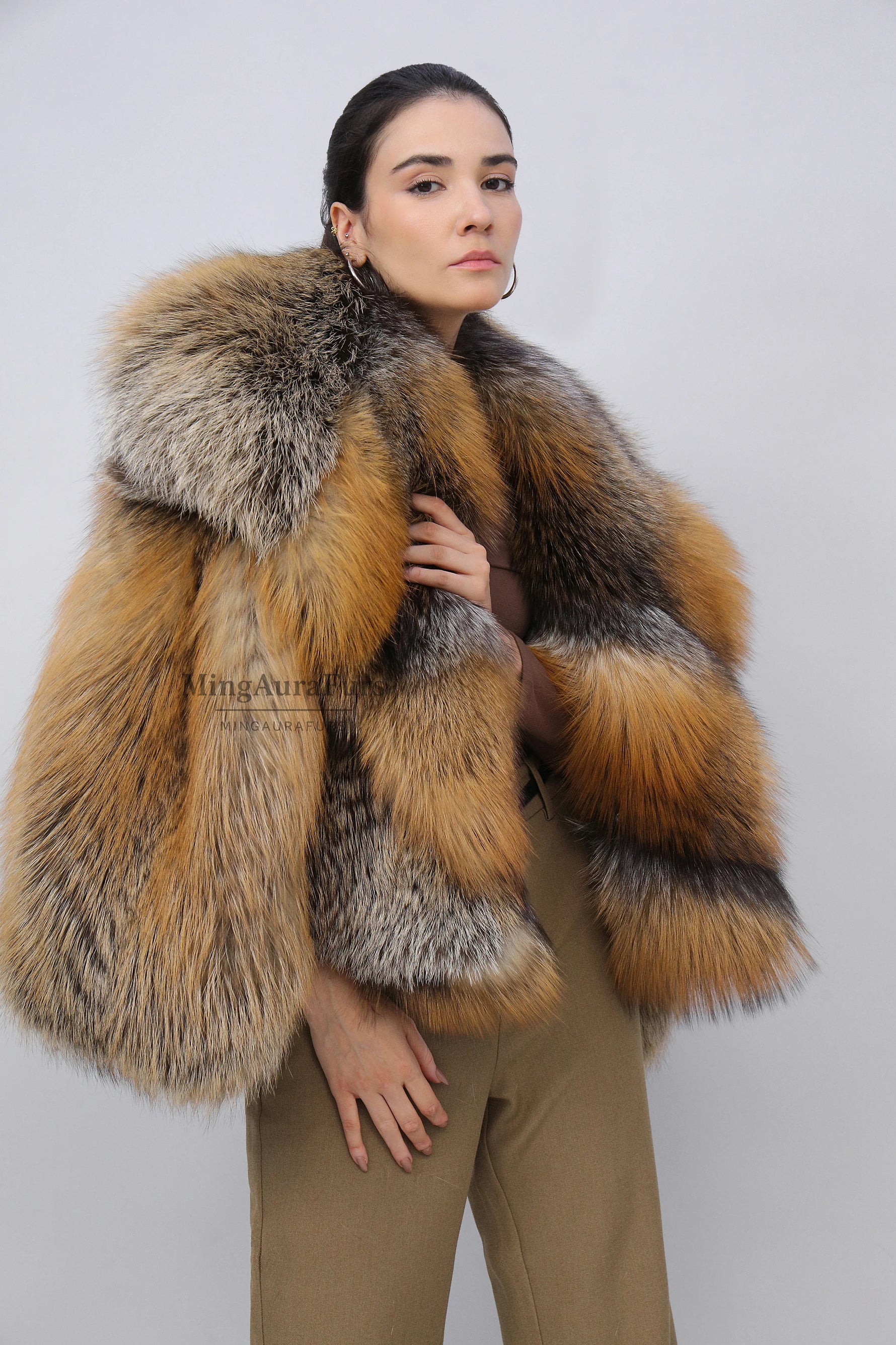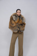 Women's Real Fox Fur Coat -Oversized Collar- Phnom Cross Fox - B0011